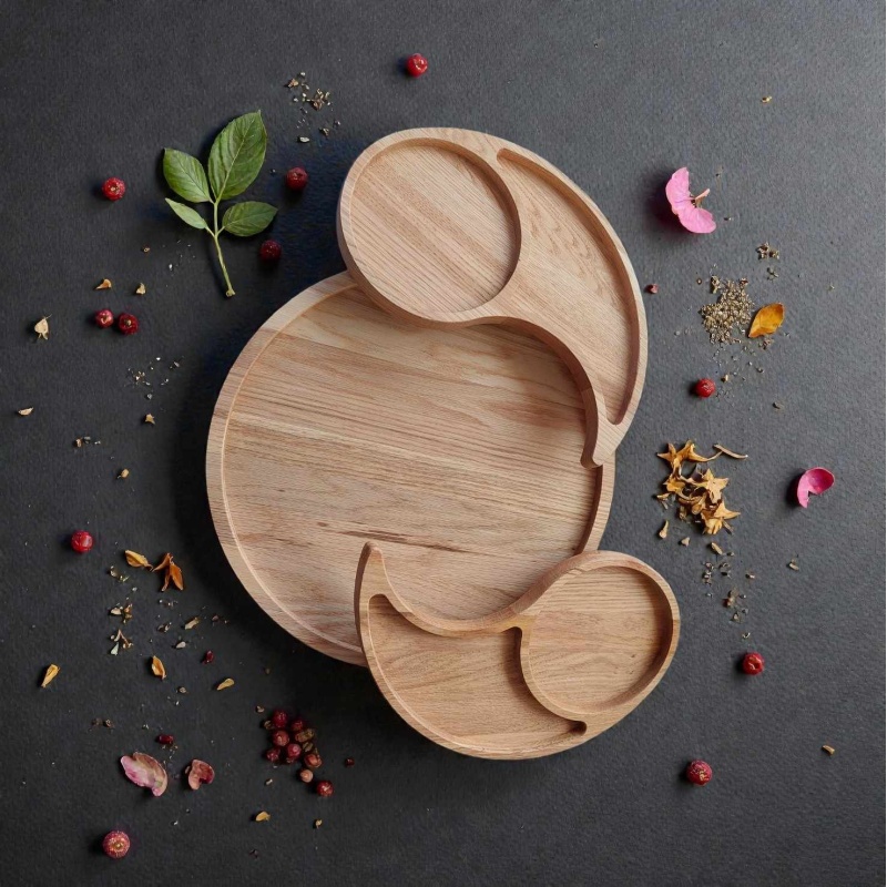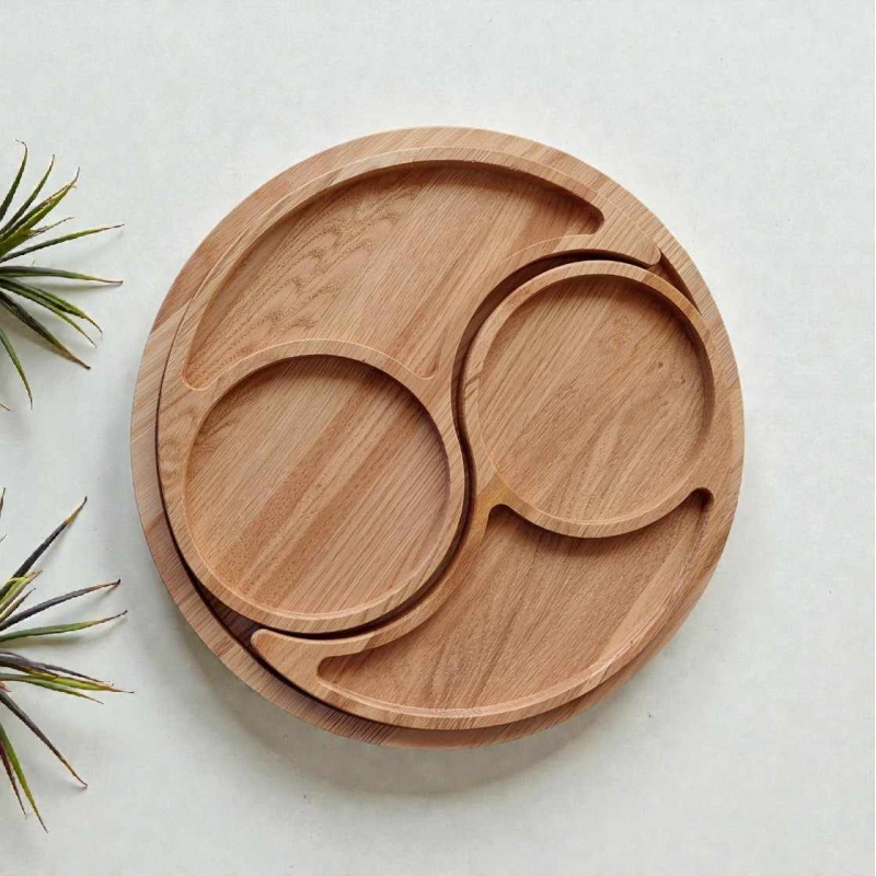 Elegantne ümmargune serveerimisalus on valmistatud kvaliteetsest Ameerika tammest. Alusel on kolm eraldi süvendit ühel ringikujulisel alusel, mis võimaldavad serveerida erinevaid suupisteid, lisandeid või kastmeid — pakkudes korraga nii praktilist kui ka kaunist lauale asetuvat lahendust.